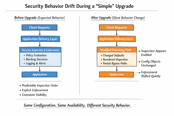 Figure 1: Security behavior drift during a “simple” upgrade. The diagram illustrates how preserved configuration and uninterrupted availability can still result in altered inspection order, enforcement behavior, and reduced visibility after a platform upgrade.